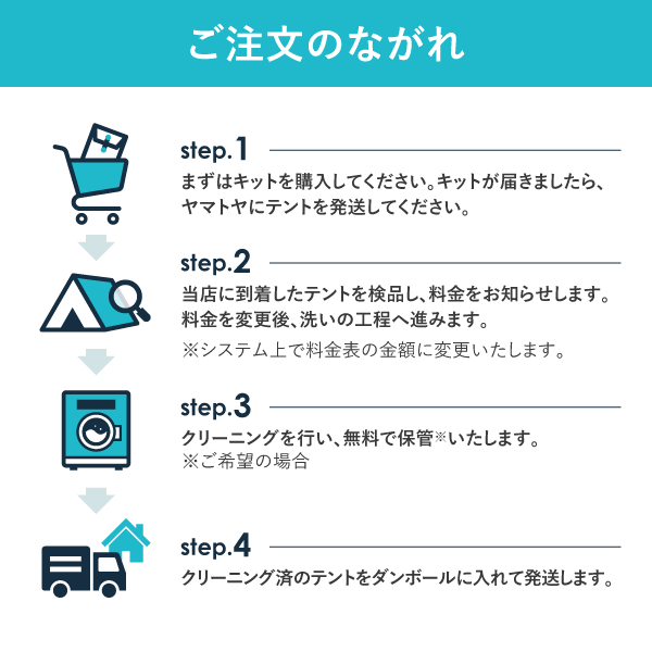 ヤマトヤクリーニングにテントをクリーニング&保管をする場合は以下のような流れで進めていきます。