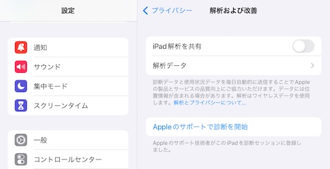担当者の案内に従い、 設定アプリを開き、 「解析および改善」タップします。