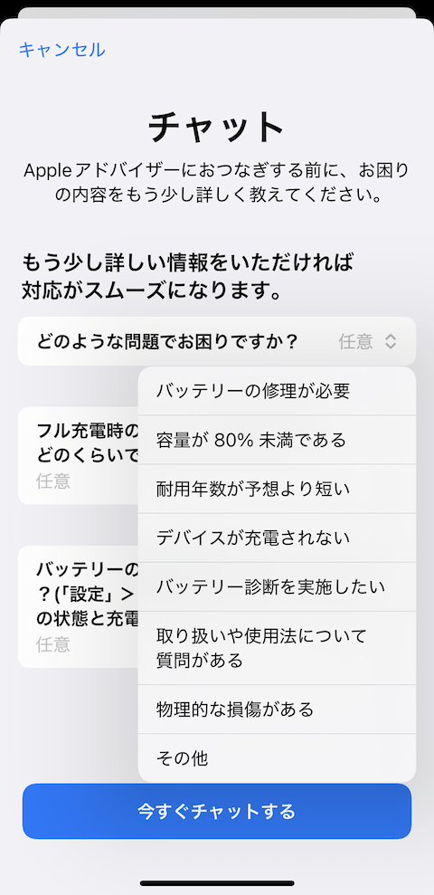 「どのような問題でお困りですか」という画面になったら、プルダウンメニューから「バッテリーの診断を実施したい」を選択し「今すぐチャットする」に進みます。
